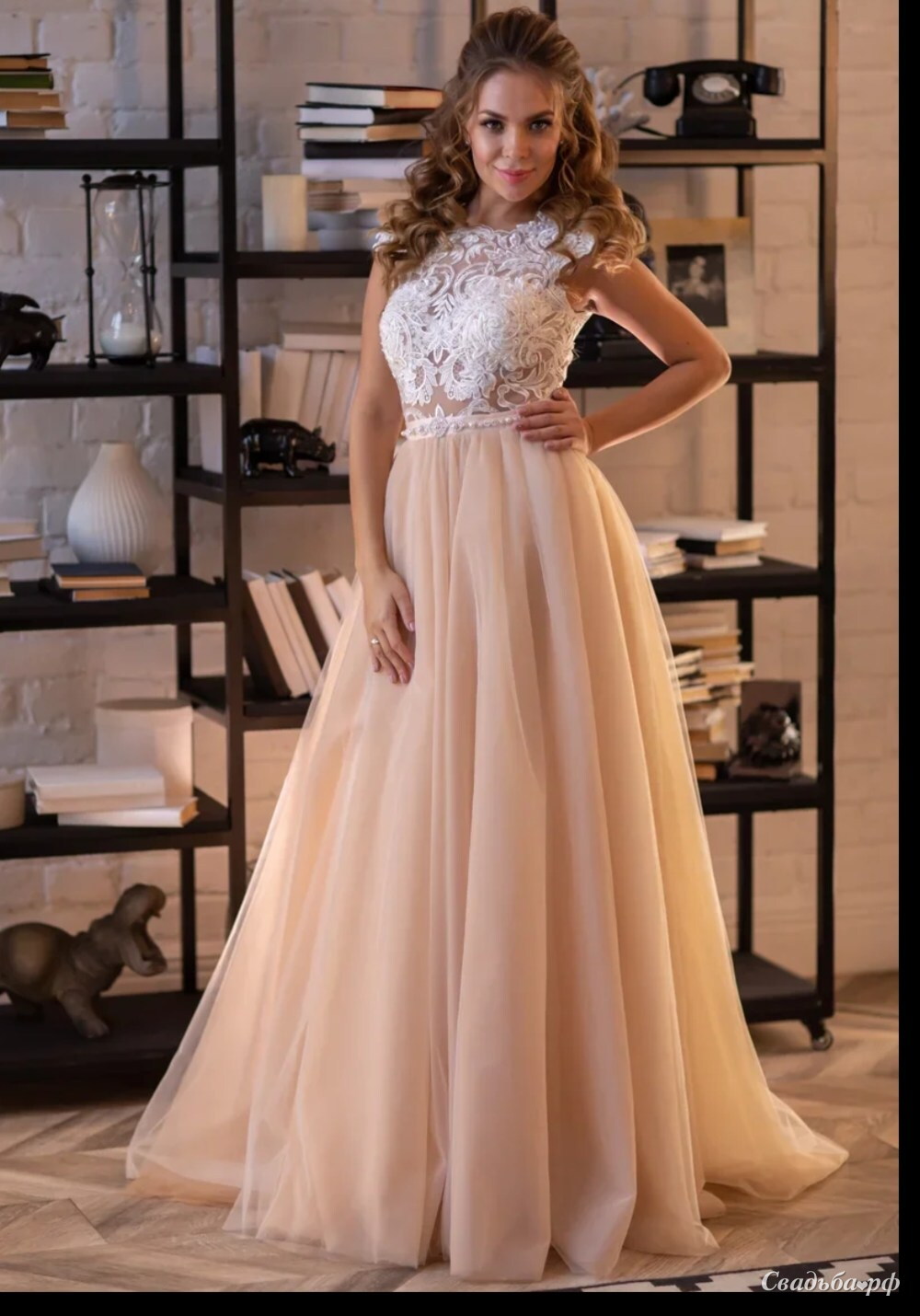 Нежное пудрово-молочное платье с лёгкой юбкой. Полупрозрачный лиф создаёт романтичный образ.