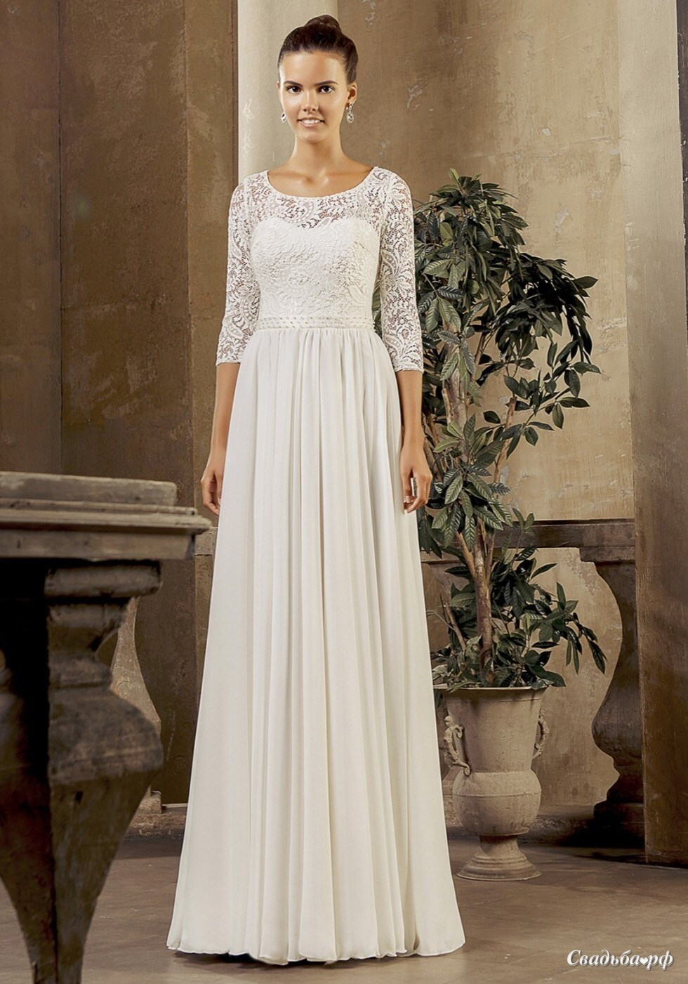 Очень нежное лаконичное платье с рукавами и закрытой спинкой. Лёгкая юбка придаёт романтичность. Платье идеально для камерной свадьбы и венчания.