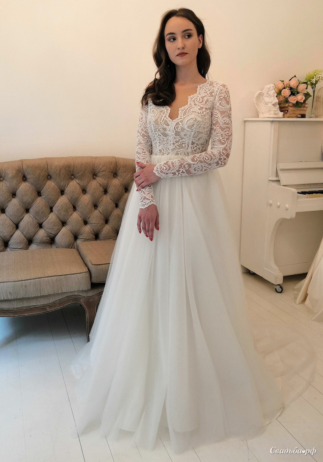 Роскошная модель с кружевным верхом, в классическом стиле с простой юбкой и небольшим шлейфом. Лаконичность - главная деталь. Очень красиво и современно.