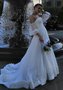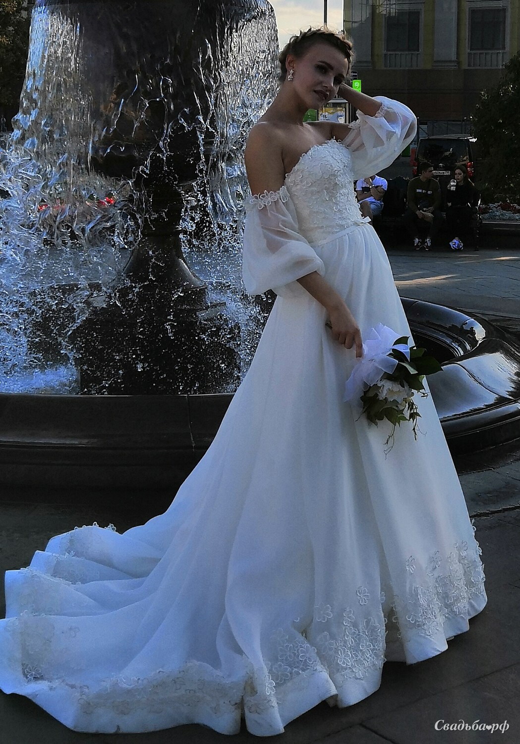 Роскошное платье с пышной юбкой, рукавчиком фонарик и открытой зоной декольте. Платье украшено кружевными 3D цветами, что создаёт очень романтичный образ.