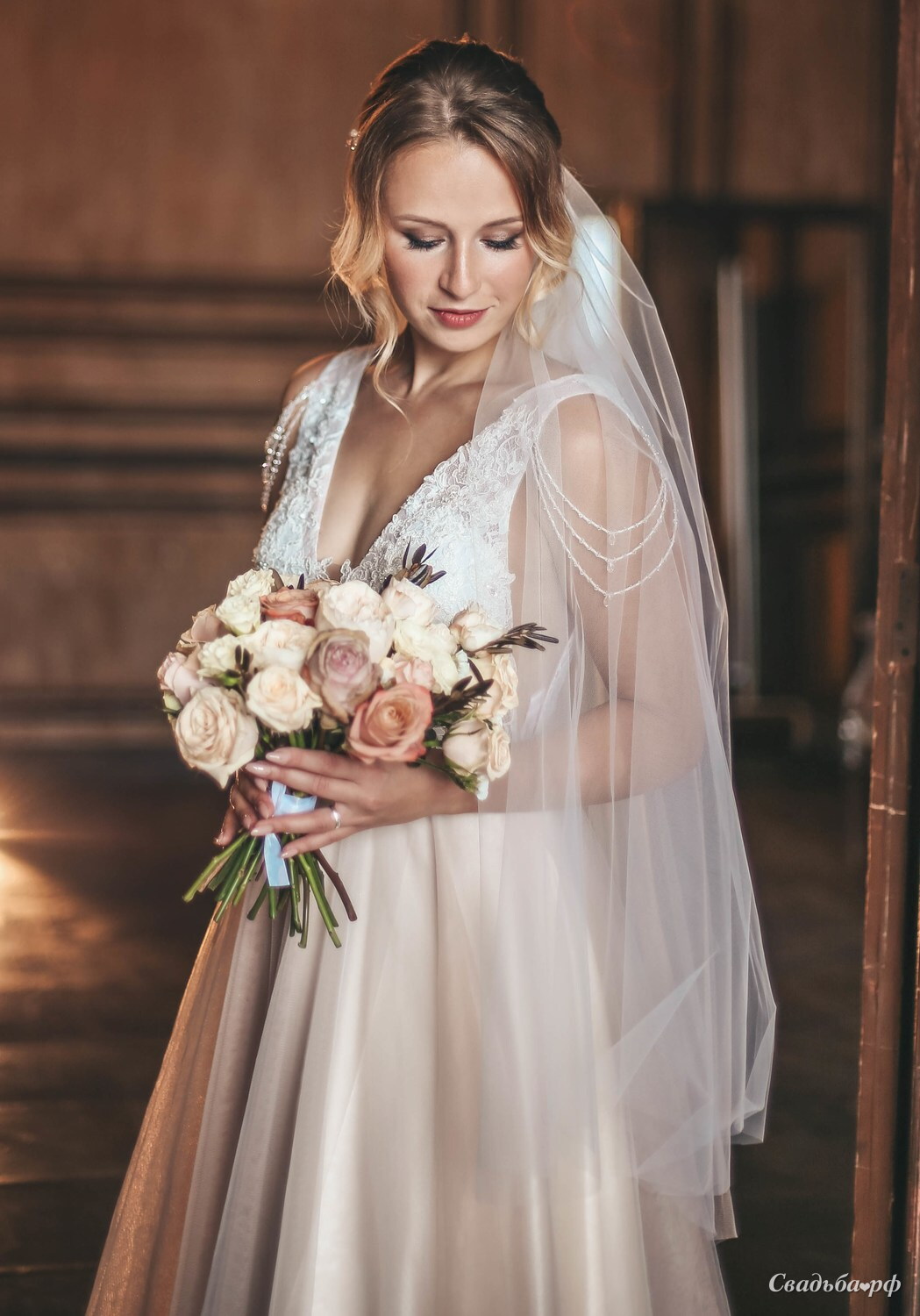 Очень нежное платье с открытой зоной декольте. Лиф платья украшен цветочным аппликациями и расшит бисером, жемчугом и стразами. Плечики украшены бусами с хрусталиками. Юбка из шелкового фатина, мягко струится и переходит в шлейф.