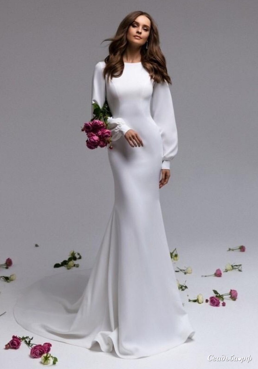 Роскошное свадебное платье из мягкого крепа мягко струится по фигуре и подчёркивает стройность невесты. Длинный рукав с высоким манжетом придаёт образу изящность, торжественность и особый шик.