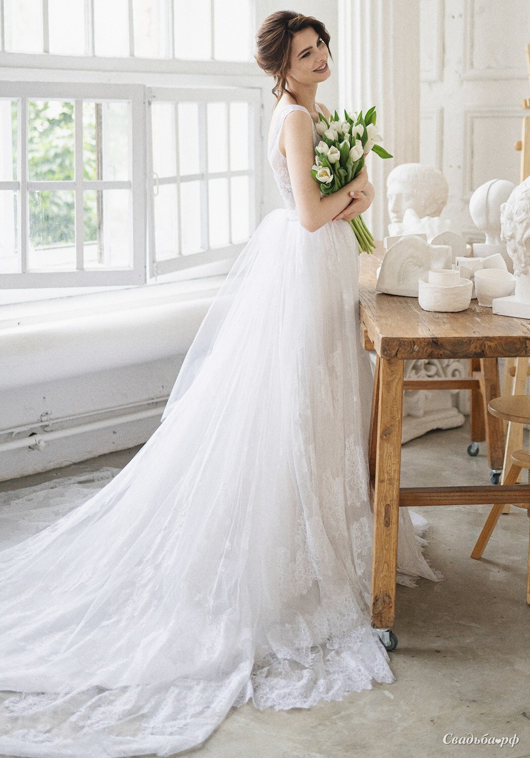 Утонченно платье А силуэта с роскошной юбкой из нежного Шантильи и прозрачным лифом, расшитым невидимым пайетками. Лёгкое мерцание придаёт шарм обралу. При желании верх можно закрыть более плотной тканью.