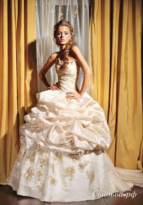 Поистине королевский наряд создан для самой требовательной и стильной невесты. Драпированный корсет с соблазнительной зоной декольте идеально облегает фигуру. Пышная юбка с объёмными сборками драпировки и золотистой вышивкой ручной работы дополнена шлейфом. В салоне представлен большой выбор свадебных аксессуаров и обуви.