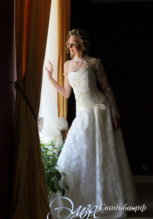 Эффектное свадебное платье от лучших итальянских дизайнеров эксклюзивно представлено в Москве. Единственный длинный рукав из тонкого кружева придаёт образу особый шик и загадочность. Заниженный корсет с открытой зоной декольте украшен атласным поясом. Длинная юбка с ажурными вставками струится до самого пола. Вам позавидует сама весна!