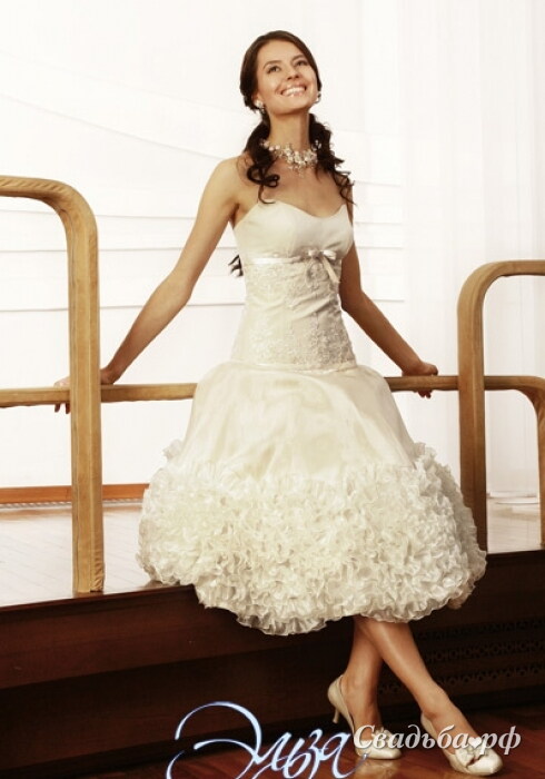 Кокетливое свадебное платье выполнено из атлас аи органзы. Заниженный корсет с пикантной зоной декольте и кокетливым бантиком под грудью подчёркивает женственные формы. Пышная юбочка с оригинальными сборками по нижнему краю придаёт образу игривость. В салоне представлен большой выбор свадебных аксессуаров и свадебной обуви.