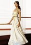 Свадебное платье в стиле ампир создано лучшими дизайнерами Италии. Открытая зона декольте обрамлена тонкими бретелями. Грудь украшена золотистой вышивкой ручной работы. Широкий пояс с бантом подчёркивает талию. Длинная юбка свободного покроя струится до самого пола. В салоне представлен большой выбор свадебной обуви и свадебных аксессуаров.
