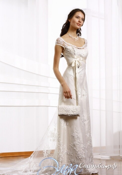 Женственный наряд с вырезом-лодочкой на груди и миниатюрными рукавами-фонариками создан для романтичных натур. Завышенная талия украшена атласным поясом с бантом. Длинная юбка прямого покроя дополнена верхним слоем из тонкого кружева и невесомым шлейфом. В салоне представлен большой выбор свадебных аксессуаров и свадебной обуви.
