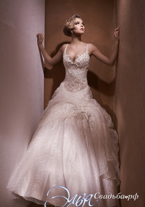 Оригинальный свадебный наряд эффектно подчеркнёт женственные изгибы Вашего тела. Ажурный корсет с пикантной зоной декольте и тонкими бретелями привлекает внимание. Пышная юбка с объёмными сборками драпировки придаст Вашему образу неповторимый шик. В салоне представлен большой выбор свадебных аксессуаров и свадебной обуви.