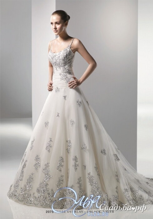 Романтичный наряд с открытой зоной декольте и тонкими бретелями создан для нежных красавиц. Корсет идеально садится по фигурке и подчёркивает женственные изгибы. Пышная юбка перетекает в шлейф. Платье по всей длине украшено ажурными вставками, расшитыми вручную. В салоне представлен большой выбор свадебных аксессуаров и свадебной обуви.