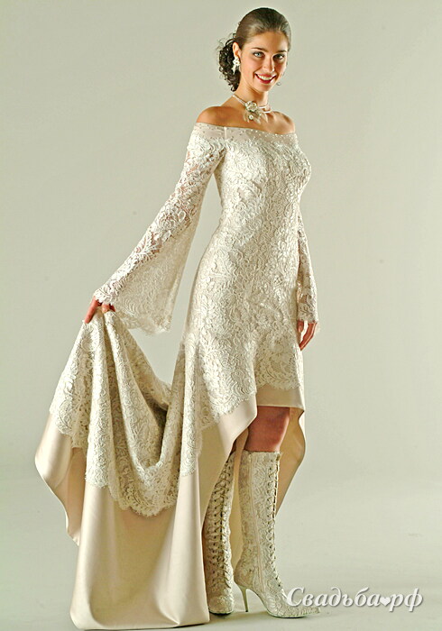 Самым стильным и романтичным невестам приглянётся это свадебное платье с приспущенными плечиками расклешёнными рукавами. Спереди юбка приоткрывает колени, а сзади переходит в роскошный шлейф. Наряд украшен расшитым вручную кружевом. Элегантно и неповторимо. В салоне представлен большой выбор свадебных аксессуаров и свадебной обуви.