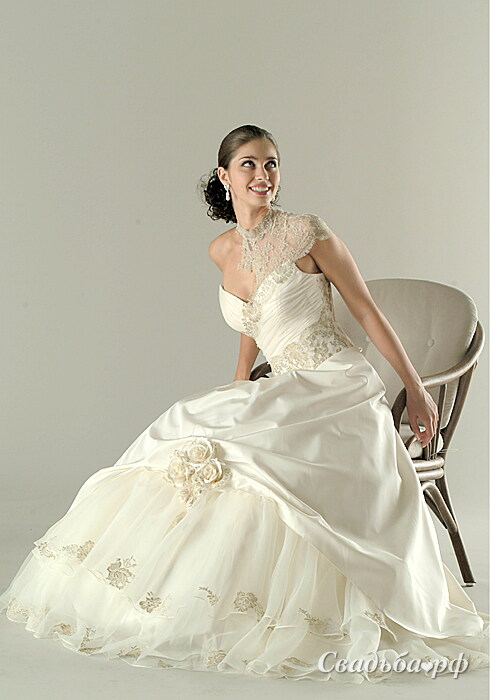 Оригинальное свадебное платье от ведущих отечественных дизайнеров привлекает внимание к зоне декольте, благодаря кружевной вставке на одно плечо. Корсет подчёркивает женственные изгибы фигуры. Пышная юбка с драпировкой и нежным подъюбником украшена цветами ручной работы. В салоне представлен большой выбор свадебных аксессуаров и свадебной обуви.
