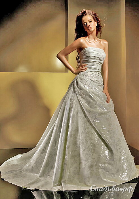 Изюминкой этого итальянского свадебного платья является его оригинальная фактура. Наряд отличается минимализмом декора и безупречным А-силуэтом. Драпированный корсет с пикантной зоной декольте гармонично сочетается с пышной юбкой. Модель дополнена восхитительным шлейфом. В салоне представлен большой выбор свадебных аксессуаров и свадебной обуви.