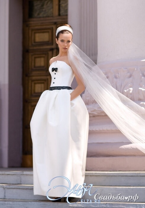 Великолепное платье-тюльпан представлено лучшими дизайнерами Италии для стильных невест. Миниатюрный корсет с открытой зоной декольте и кокетливым бантиком на груди дополнен контрастным поясом и пуговицами спереди. Длинная юбка с карманами приковывает к себе внимание. В салоне представлена большая коллекция свадебной обуви и аксессуаров.