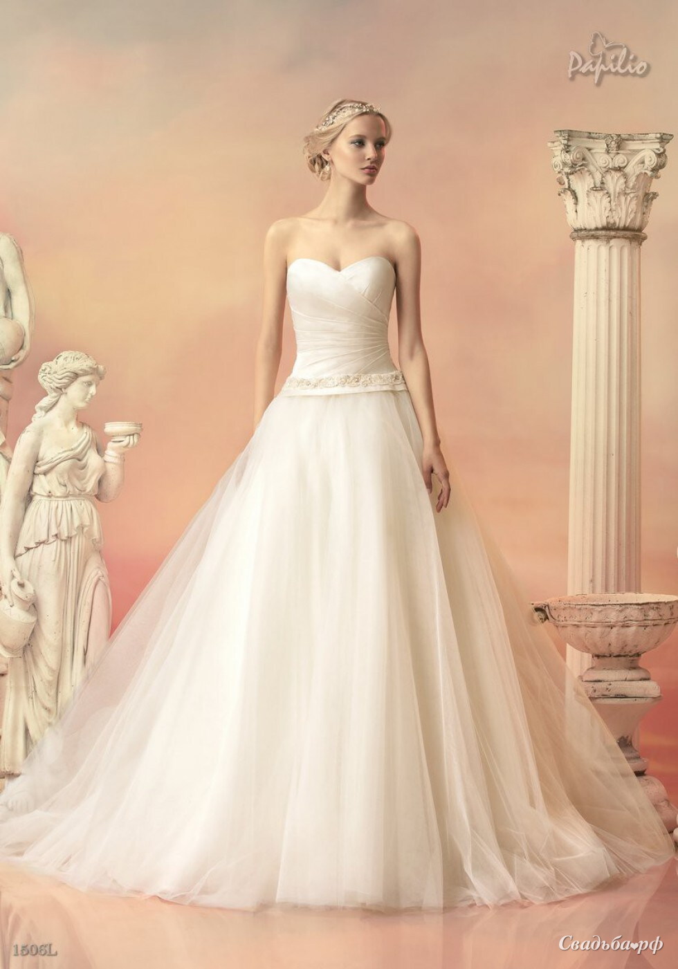 Пышное роскошное платье, с декольтированным лифом и расшитой баской. Данная модель предлагается с отстегивающимся треном. Возможно использование, как в дорогом варианте - из натурального шелкового атласа дюшес, так и в бюджетной версии - из классического атласа.