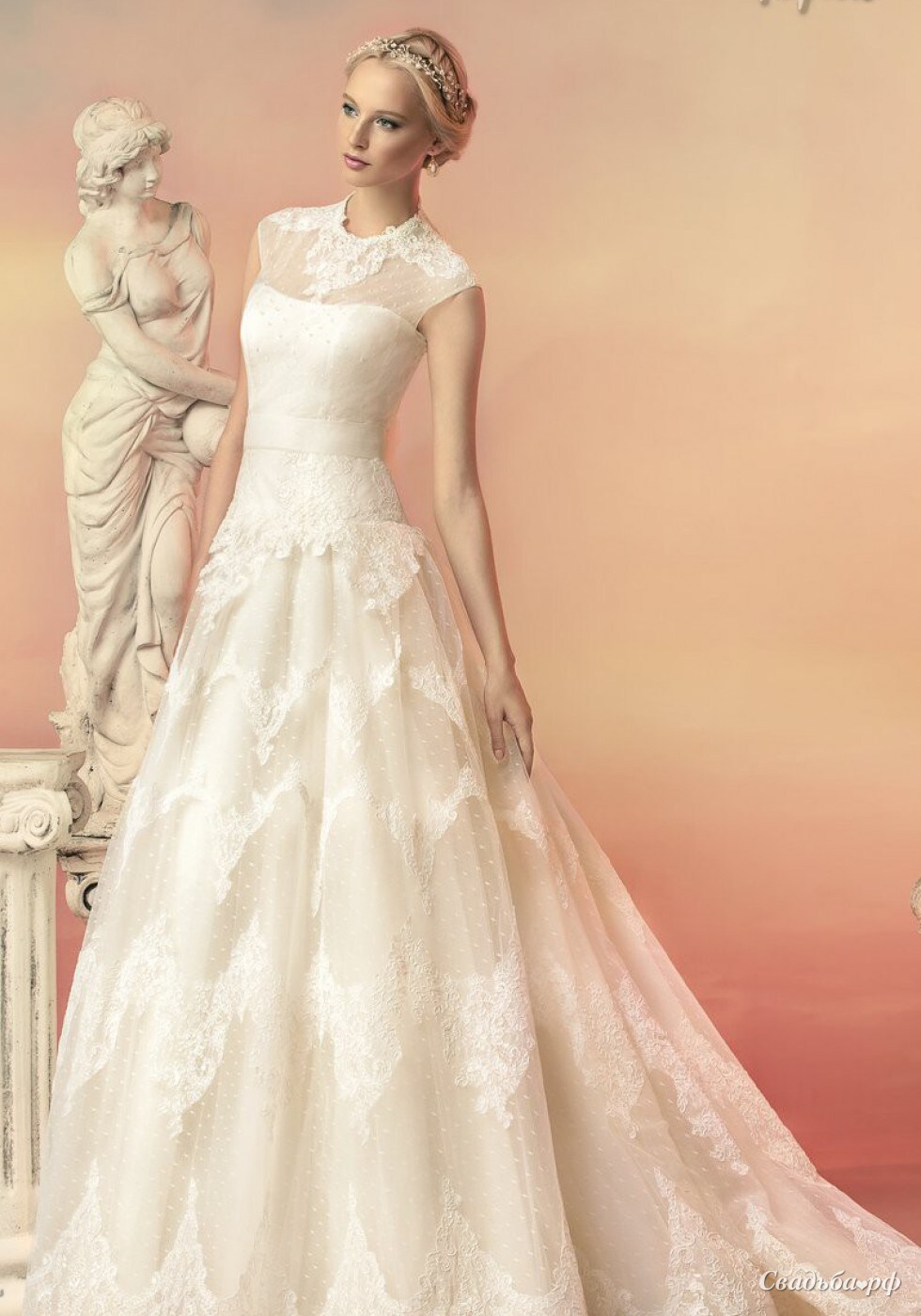 Пышное платье с закрытым лифом подобранное по линии талии поясом с декорированным цветком. Вырез платья вышит бисером и стразами.