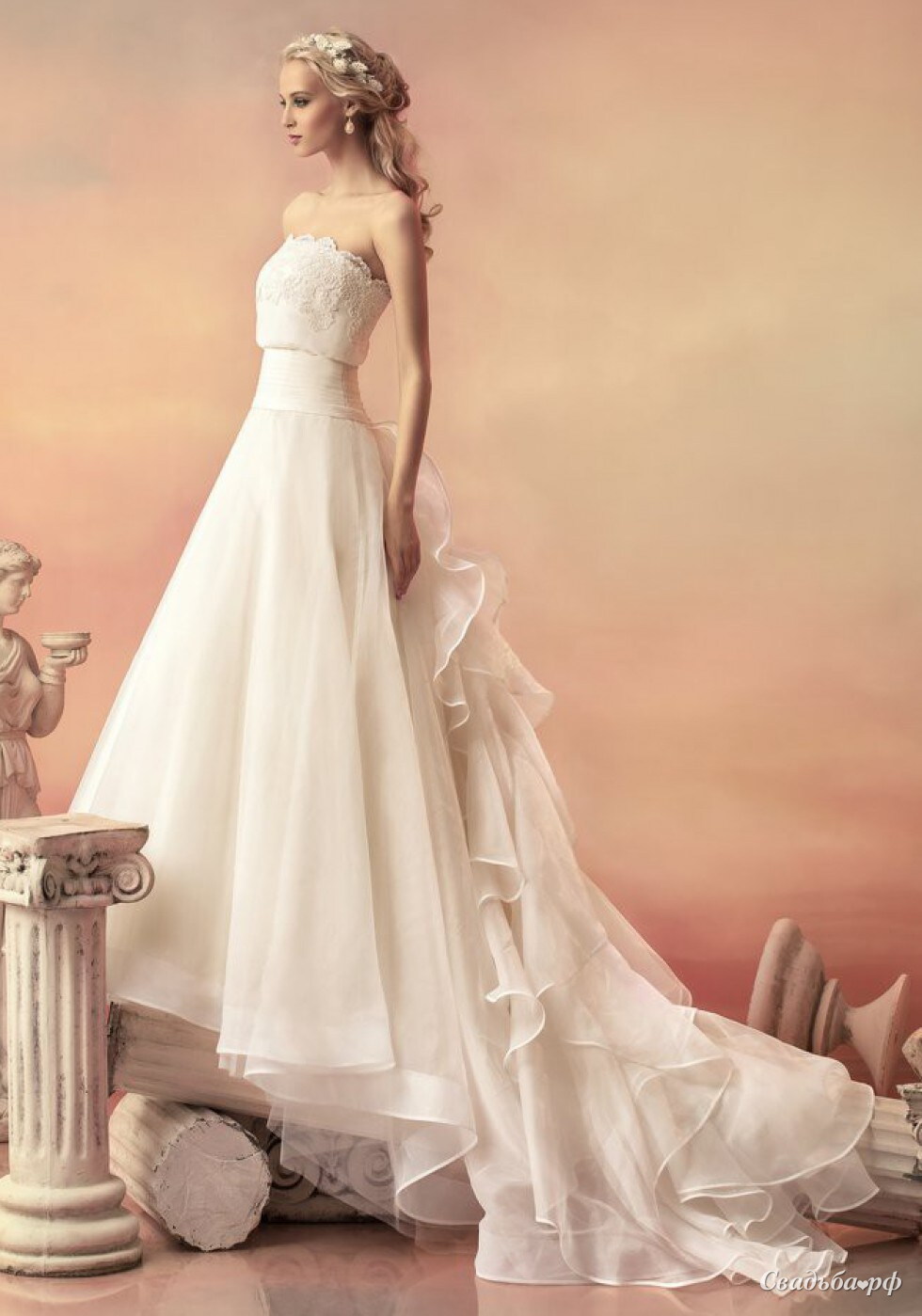 Декольтированное платье из легкой воздушной органзы со свободно спадающим кружевным лифом и роскошно настрочными воланами по шлейфу.