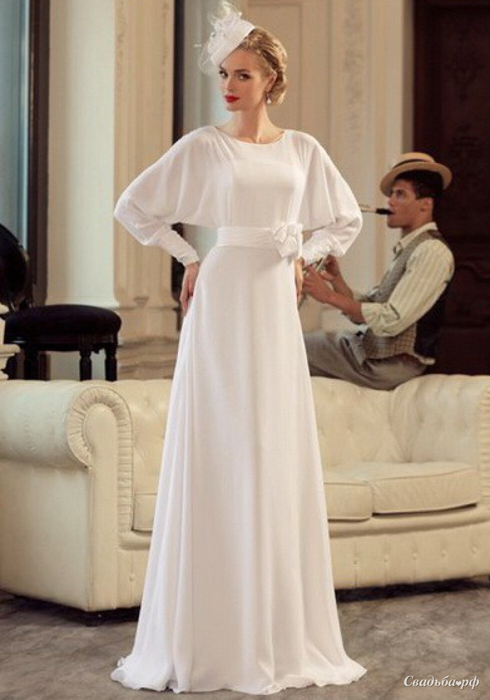Легкое свадебное платье из шифона с закрытым верхом и рукавами. Манжет отделан кружевом.