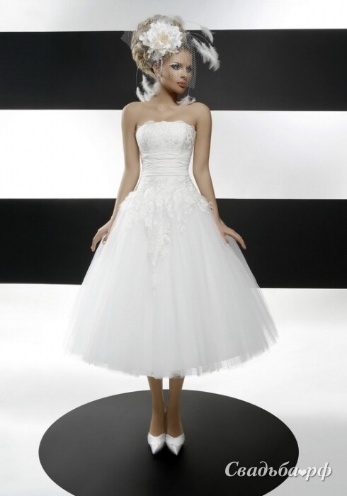 Кокетливый свадебный наряд с открытой зоной декольте выполнен из жан-жана и тонкого кружева. Такое платье в духе 70-ых годов поможет создать игривый образ обворожительной невесты. Талия подчёркнута широким поясом. Пышная юбочка приоткрывает лодыжки. Корсет украшен цветами, словно стекающими на верхнюю часть юбки.