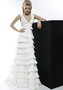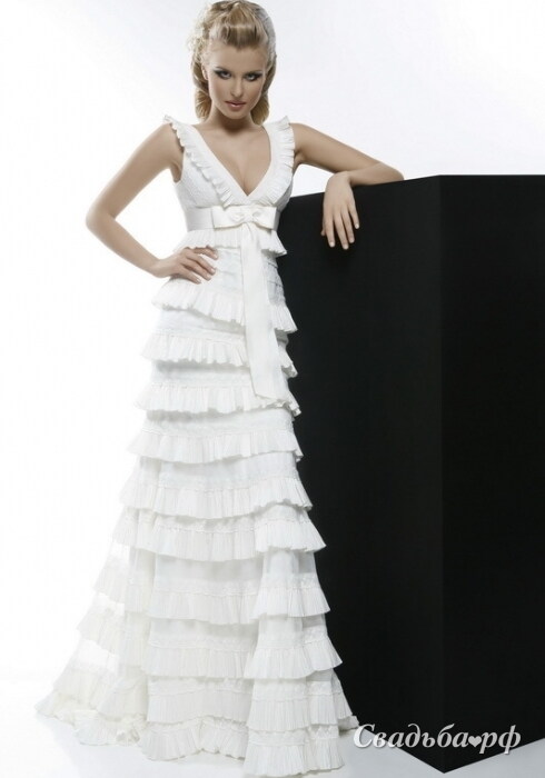 Оригинальный свадебный наряд с глубоким V-образным вырезом на груди и оборками на бретелях выполнен в стиле 20-х годов. Завышенная талия украшена бантом. Длинная юбка со множеством ярусов чуть расширяется к полу. Сочетание нежного кружева, тонкой сетки и жан-жана придаст вашему свадебному образу особый шик.