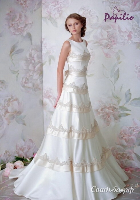 Романтичный свадебный наряд из благородного атласа декорирован горизонтальными вставками вручную расшитой каймы. Закрытая зона декольте со скромным вырезом-лодочкой придаёт образу целомудренность. Платье идеально садится по фигуре и подчёркивает талию. Длинная юбка с небольшим шлейфом расширяется к полу.