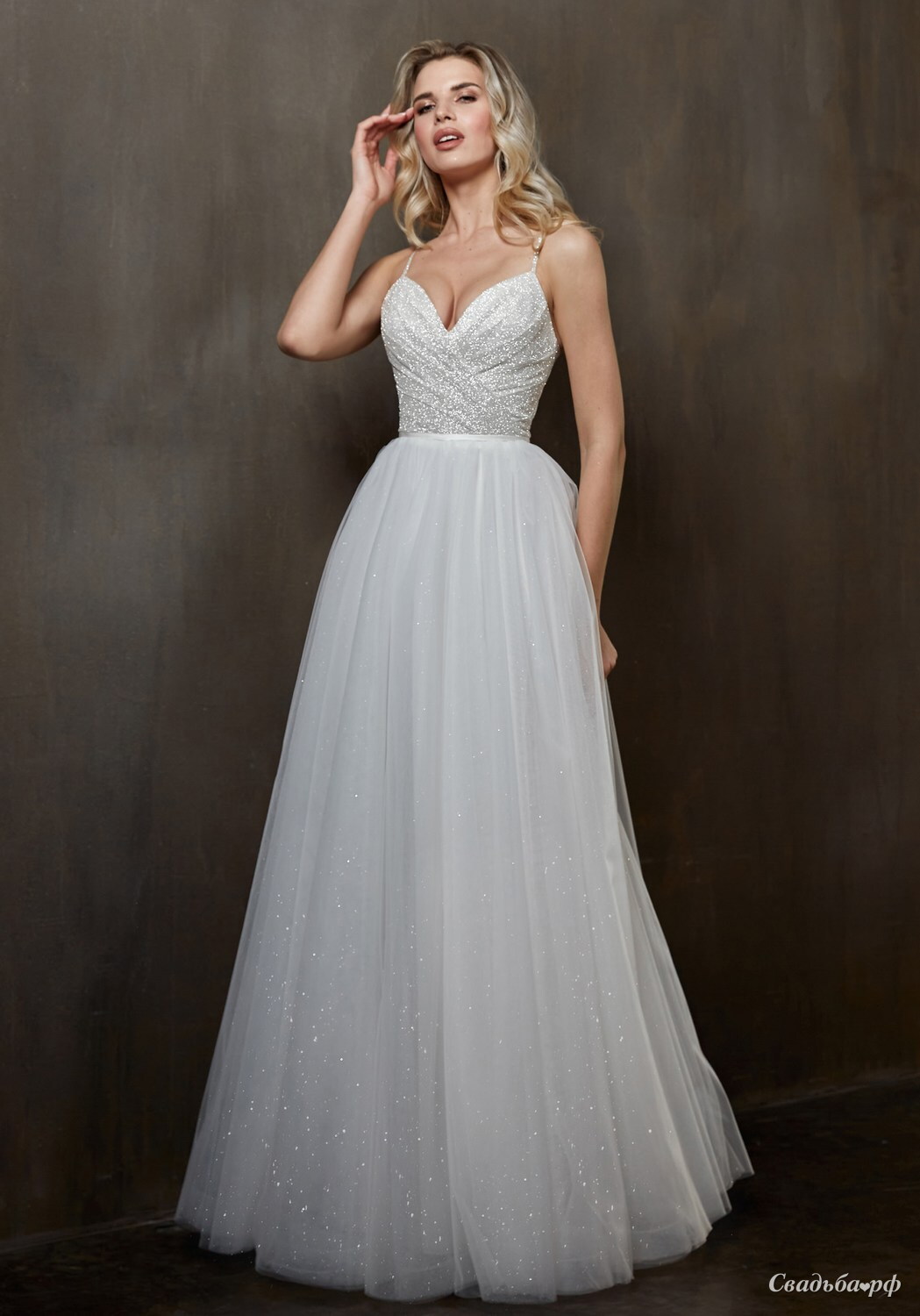 Нежное свадебное платье А-силуэта, в котором Вы будете чувствовать себя настоящей принцессой. Корсет платья украшает драпировка из роскошного золотого глиттера, а воздушная юбочка усыпана тысячами маленьких блестящих частичек.