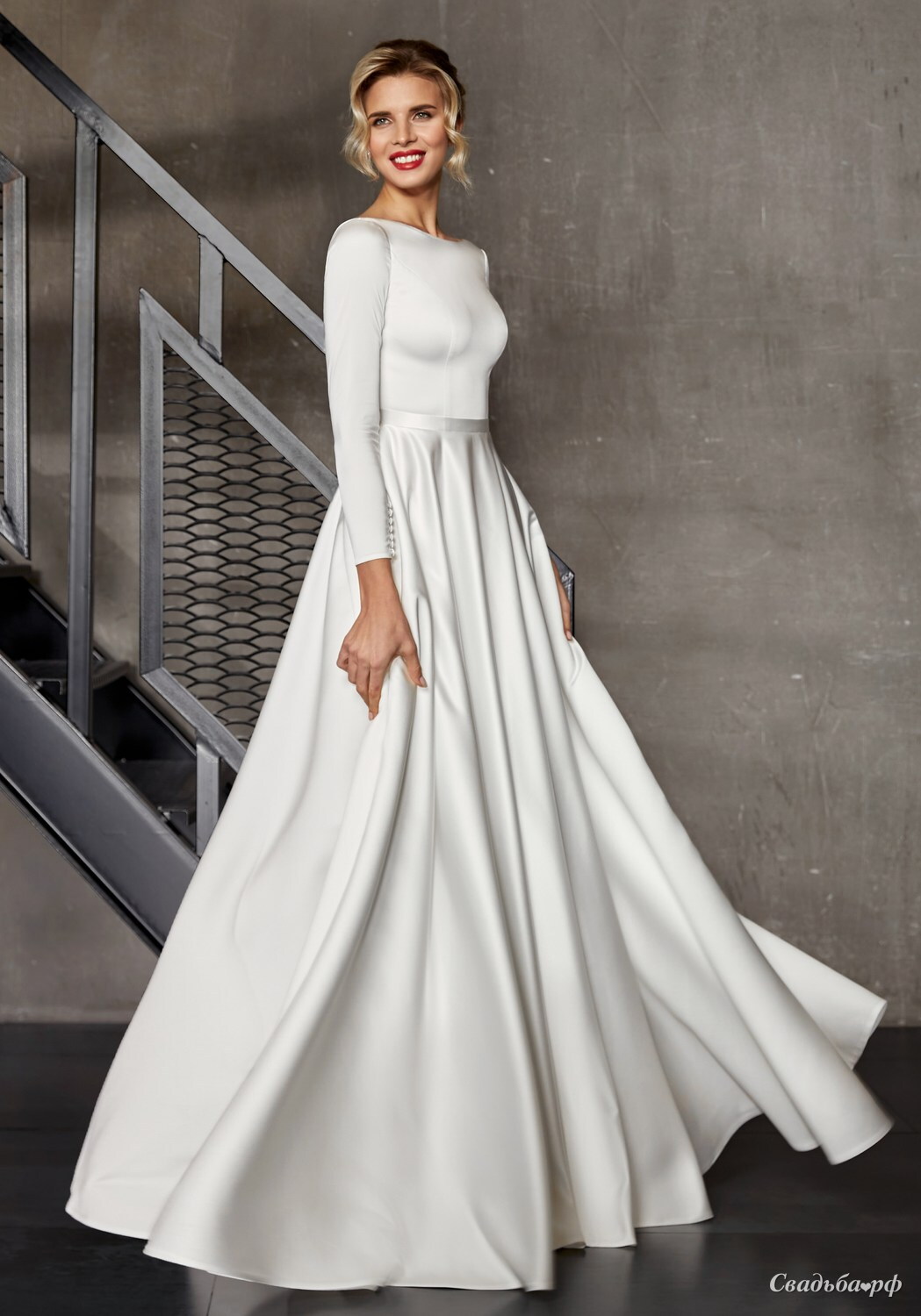 Кропотливая работа дизайнеров и портных осуществила мечту многих девушек – идеальное свадебное платье. Юбка А-силуэта, длинные рукава, вырез на спинке – все эти элементы прекрасно сочетаются, создавая идеальный образ невесты. Благодаря грамотно подобранным материалам, рукава не будут стеснять движения и спадать с плеч.