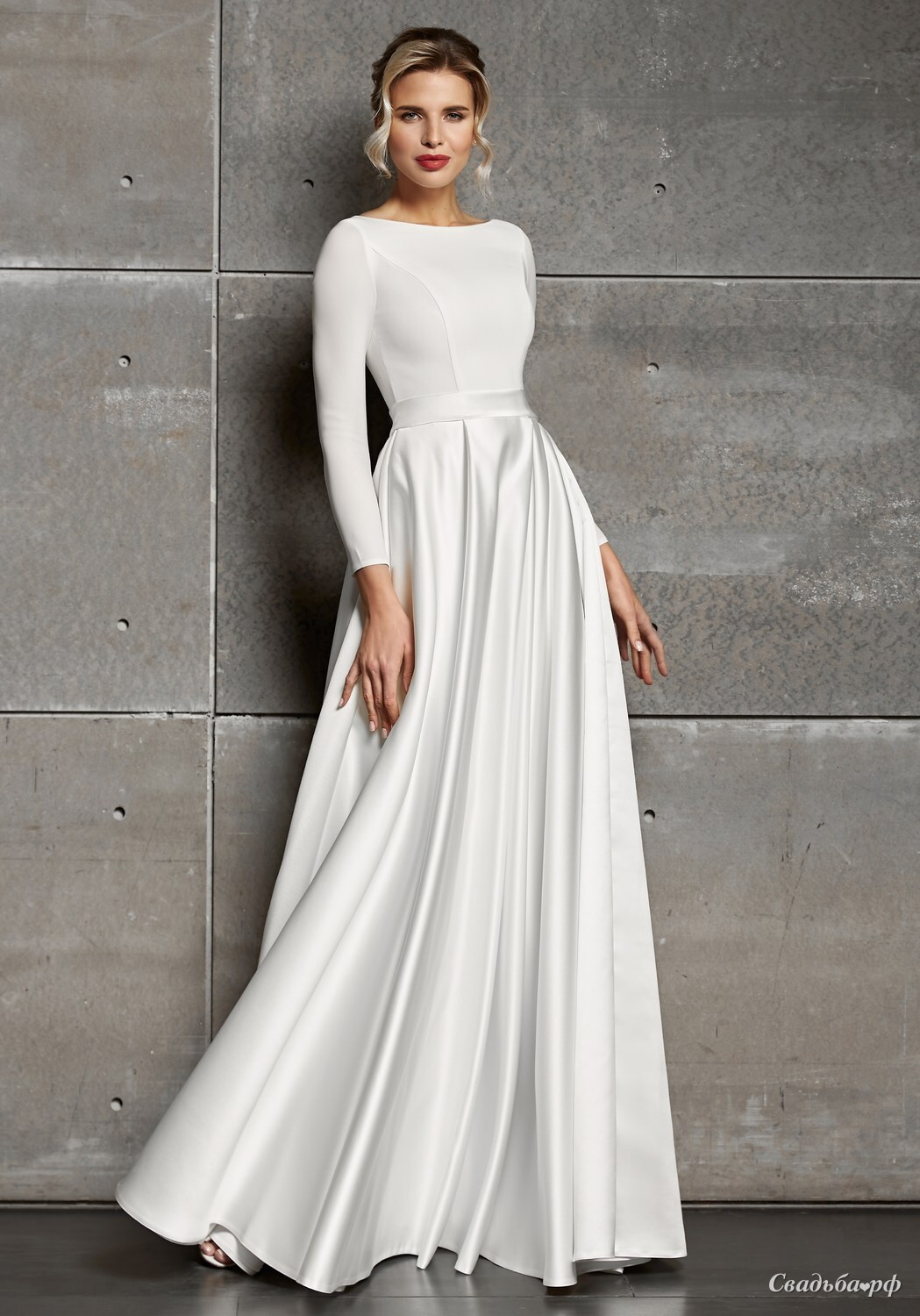 Длинные рукава, классический крой, полностью закрытый бескорсетный лиф и ряд пуговичек по спинке – это платье цепляет взгляд своей благородностью и элегантностью.