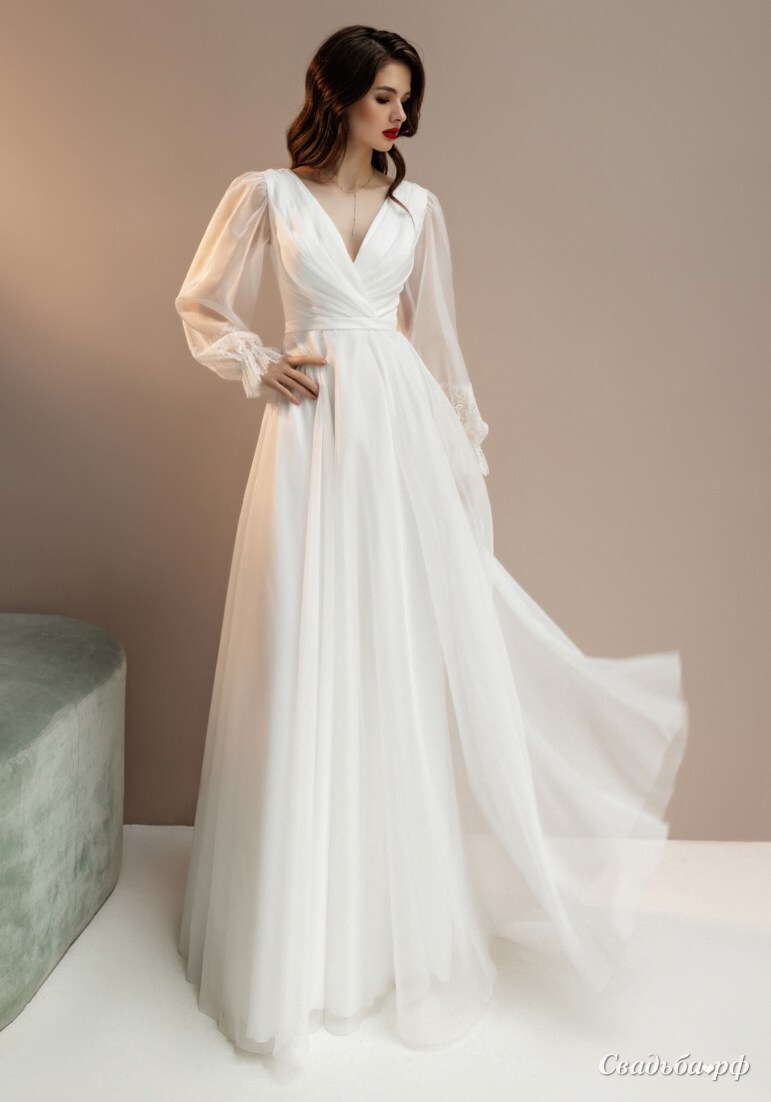 Это великолепное свадебное платье с воздушными рукавами идеально подходит для современной невесты, которая хочет выглядеть утонченно и нежно в свой особенный день. Лиф с глубоким V-образным вырезом выполнен из тонкой органзы аккуратно задрапирован, что создает ощущение воздушности. Глубокий вырез и полупрозрачные рукава с кружевными краями создают стильный и романтичный образ. Талию подчеркивает тонкий атласный пояс. Платье застегивается сзади на молнию. Свободные рукава украшены нежным кружевом. Независимо от того, выходите ли вы замуж на традиционной церковной церемонии или на открытом воздухе в саду, это свадебное платье из органзы с воздушными рукавами позволит вам почувствовать себя принцессой.