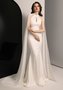 Изысканное свадебное платье выполнено из стрейчевого атласа и имеет облегающий силуэт рыбка, который подчеркивает формы невесты. Ключевой особенностью этого платья является кейп из шифона, который создает эффект легкости и воздушности, придавая платью изысканный и романтичный вид.