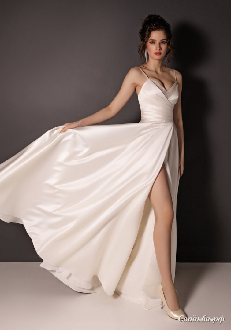 Оно изготовлено из атласа нежного жемчужного оттенка, который смотрится невероятно элегантно. Лиф украшен драпировкой из глиттера, которая добавляет блеск и роскошь образу. Вырез декольте в форме сердечка подчеркивает женственные формы невесты и придает образу нотку сексуальности. Юбка имеет разрез, который привносит в образ игривость и женственность и позволяет продемонстрировать красивые ножки.
