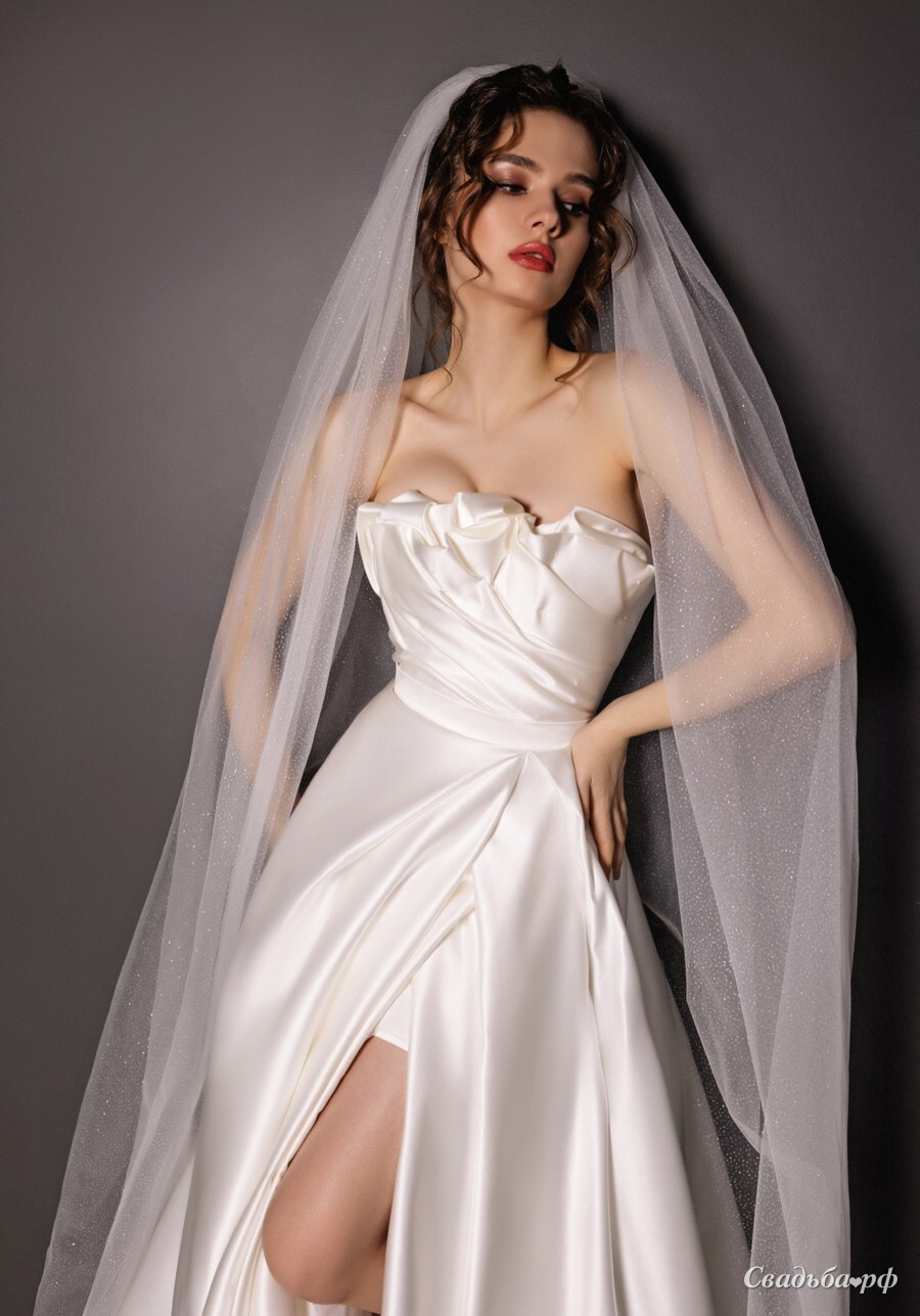 Корсетный лиф платья имеет нетривиальную драпировку, которая придает ему особый шарм. Платье выполнено из атласной ткани, которая создает роскошный и изысканный образ. Юбка короткого платья имеет прямой крой и отлично подчеркивает фигуру, создавая красивую силуэтную линию. Съемная длинная юбка также выполнена из атласной ткани и имеет объемный крой, который создает эффект полноценного свадебного платья.