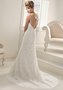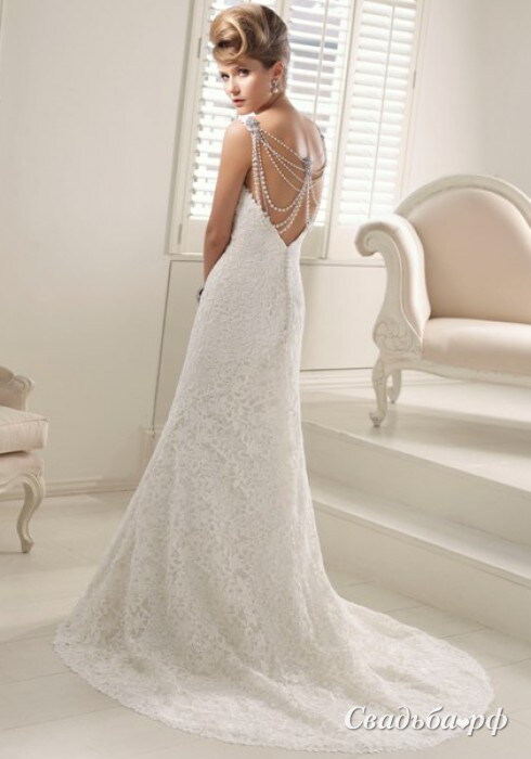 Изысканное, элегантное свадебное платье отлично подойдет для всех невест, кто хочет сделать главный праздник своей жизни незабываемым. Это платье богато декорировано сложносочиненным нежным кружевным узором. Петельки на плечах переходят в изысканные украшения – элегантные бусы, которые могут заменить прочие аксессуары.