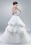 Великолепное свадебное платье, контрастный образ которого поможет любой невесте превратиться в настоящую принцессу. Плотный корсет с открытым прямым лифом расшит вертикальными рельефными узорами. А невероятно лёгкая, даже воздушная юбка, состоящая из трёх многослойных оборок, украшена красивыми объёмными цветами.