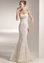 Элегантное свадебное платье из кружевного полотна с различной плотностью рельефного рисунка. Линия декольте по контуру открытого фигурного лифа украшена совсем маленькой нежной оборкой. Модель красиво обтягивает женскую фигуру, подчёркивает все её достоинства и русалочьим хвостом подола ниспадает к ногам главной героини торжества.