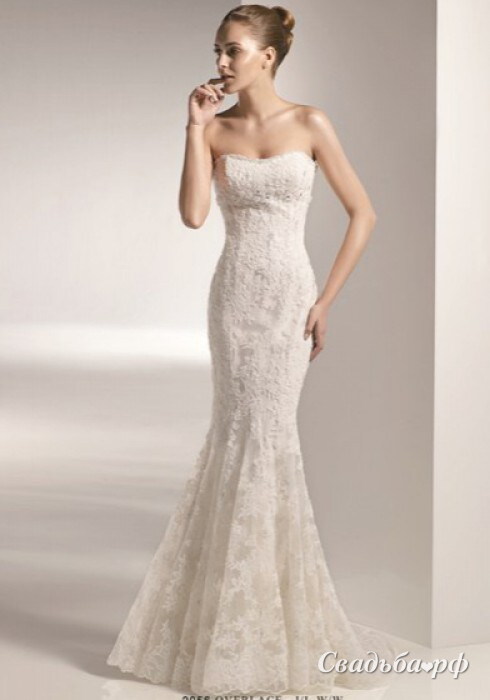 Элегантное свадебное платье из кружевного полотна с различной плотностью рельефного рисунка. Линия декольте по контуру открытого фигурного лифа украшена совсем маленькой нежной оборкой. Модель красиво обтягивает женскую фигуру, подчёркивает все её достоинства и русалочьим хвостом подола ниспадает к ногам главной героини торжества.