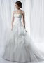 Роскошное платье для королевы свадебного бала. Зона декольте, плечи и руки открыты. Лиф выполнен из плотного кружевного полотна. Корсет - строгий, с вертикальными рельефными полосами. На линии талии снова кружева, естественным продолжением которых является невесомая многослойная юбка с множеством объёмных оборок.