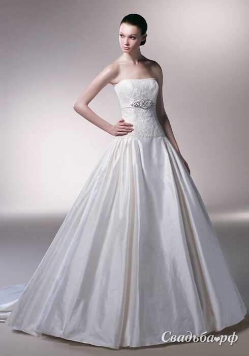 Элегантный свадебный наряд, построенный по принципу контраста. Открытый, почти прямой лиф и, облегающий фигуру невесты, удлинённый корсет выполнены из кружевной ткани с плотным рисунком. А широкая юбка с небольшим шлейфом, наоборот, из абсолютно гладкой ткани. Чуть выше талии красуется гладкий пояс с роскошной брошью.