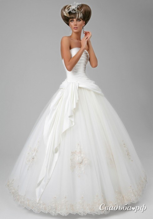 Элегантный и одновременно романтичный свадебный наряд. Лиф полностью задрапирован искусно выложенной правильными горизонтальными полосами плотной тканью. На уровне бёдер полосы превращаются в большую оборку, небрежно затянутую на боку в узел. А из-под оборки струится лёгкая пышная юбка, украшенная кружевными узорами.