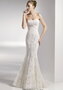 Очаровательное свадебное платье с открытой зоной декольте придётся по вкусу самым нежным и романтичным красавицам. Облегающий кружевной наряд выгодно подчёркивает все достоинства фигуры. От уровня колен модель расширяется и мягко струится до самого пола. Кокетливый шлейф дополняет образ современной невесты.