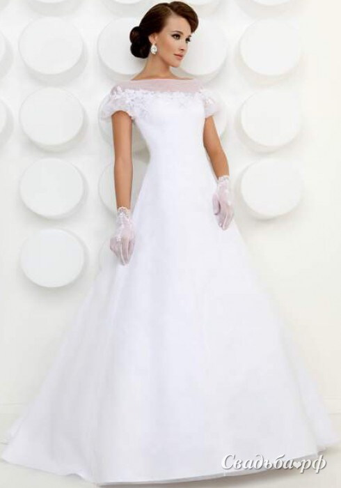 Кокетливое свадебное платье из коллекции весна 2014 отличается элегантностью и сдержанностью. Скромная зона декольте и короткие рукавчики украшены полупрозрачным кружевом и вышивкой. Длинная юбка расширяется к полу и переходит в небольшой шлейф. Наряд не перегружен лишними декоративными элементами. Стильно и безупречно!
