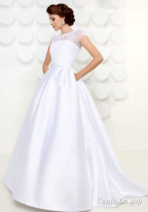 Если Вы мечтаете о стильном свадебном наряде, то эта модель из новой коллекции 2014 года создана специально для Вас! Зона декольте и плечики прикрыты нежным кружевом. Корсет также может похвастаться полупрозрачной драпировкой. Талия подчёркнута широким поясом. Пышная юбка с широкими складками и шлейфом смотрится по-королевски.