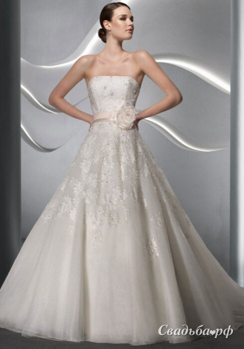 Восхитительная модель из свежей коллекции 2014 года подчеркнёт достоинства фигуры. Соблазнительный корсет с оголённой зоной декольте и открытой спинкой дополнен пояском и крупной розой. Воздушная юбка расширяется к полу и переходит в шлейф. Верхняя часть свадебного платья украшена аппликациями в форме миниатюрных цветочков.