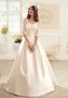 Оригинальное свадебное платье из элегантного атласа и романтичного кружева. Строгий корсет модели полностью задекорирован изысканным ажурным кружевом, кокетливо обрамляющим округлый вырез и формирующим рукава длиной ?. На спинке расположен соблазнительный вырез. Красивая мягкая юбка завершается совсем небольшим шлейфом.