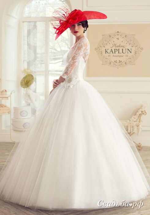Великолепное свадебное платье с классической пышной фатиновой юбкой. Фигурный лиф строгого корсета обтянут тончайшим кружевом с красивыми цветочными узорами. Кружево кокетливо прикрывает зону декольте и спускается на элегантные рукава длиной 3/4. Слегка заниженная линия талии выделена роскошной композицией со сверкающей брошью.