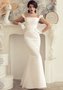 Очаровательное свадебное платье в элегантном ретро-стиле. Зона декольте кокетливо прикрыта полупрозрачной сетчатой тканью. Вырез-лодочка окантован атласом, а совсем короткие рукавчики украшены объёмными цветочными композициями. Мягкая драпировка формирует корсет с прямым лифом и плавно переходит в роскошную длинную юбку.