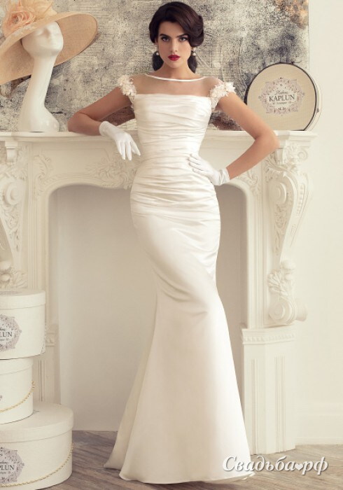 Очаровательное свадебное платье в элегантном ретро-стиле. Зона декольте кокетливо прикрыта полупрозрачной сетчатой тканью. Вырез-лодочка окантован атласом, а совсем короткие рукавчики украшены объёмными цветочными композициями. Мягкая драпировка формирует корсет с прямым лифом и плавно переходит в роскошную длинную юбку.