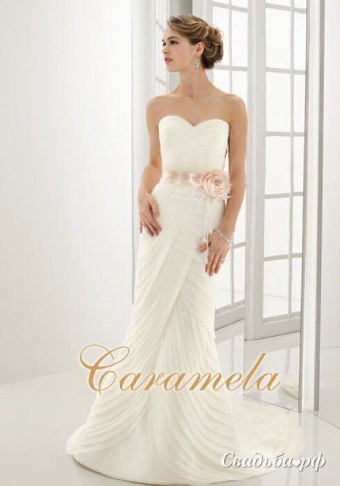Романтичное свадебное платье с открытыми плечами. Лиф сердечком. Талию подчеркивает толстая атласная лента с изящной розой. Утончения многослойная юбка, верхний слой которой украшен драпировкой с эффектом запаха. Соблазнительное декольте, открытые плечи и руки.