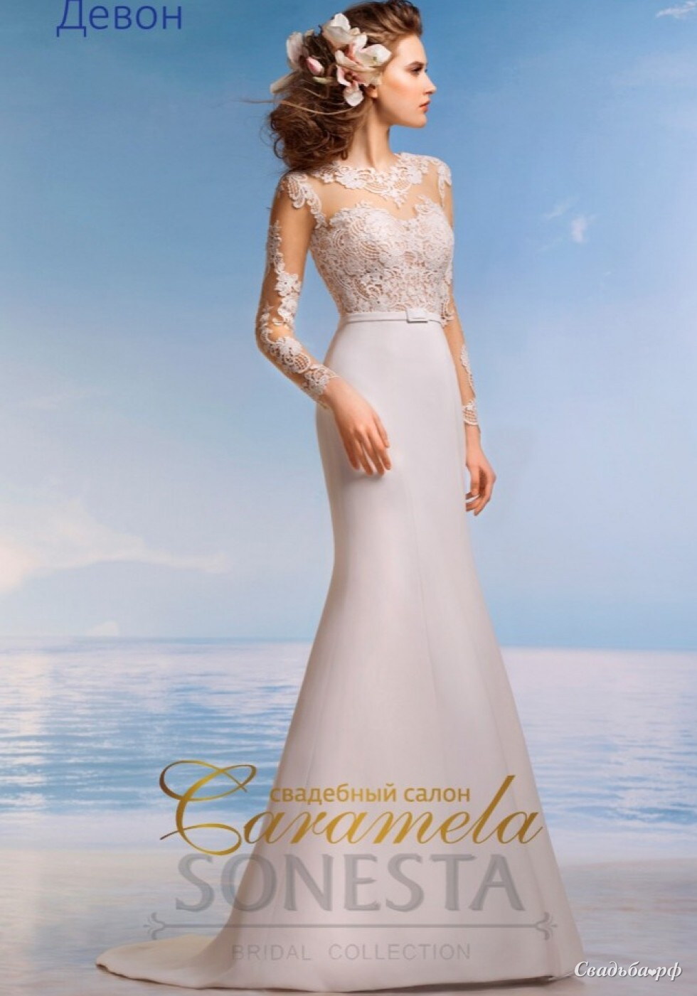 Элегантное свадебное платье с длинным рукавом. Наряд выгодно подчёркивает все изгибы фигуры. Шлейф дополняет образ.