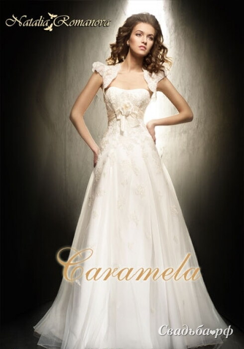 Элегантное открытое платье с кокетливым болеро, из фатина и нежнейшего кружева. Атласный пояс, завязанный под грудью на изящный бант, декорированный ажурным цветком, который выгодно подчеркивает линию талии. Многослойная юбка мягко струится от бедер, и красиво ложиться книзу. Это платье не оставит равнодушными истинных ценительниц прекрасного.
